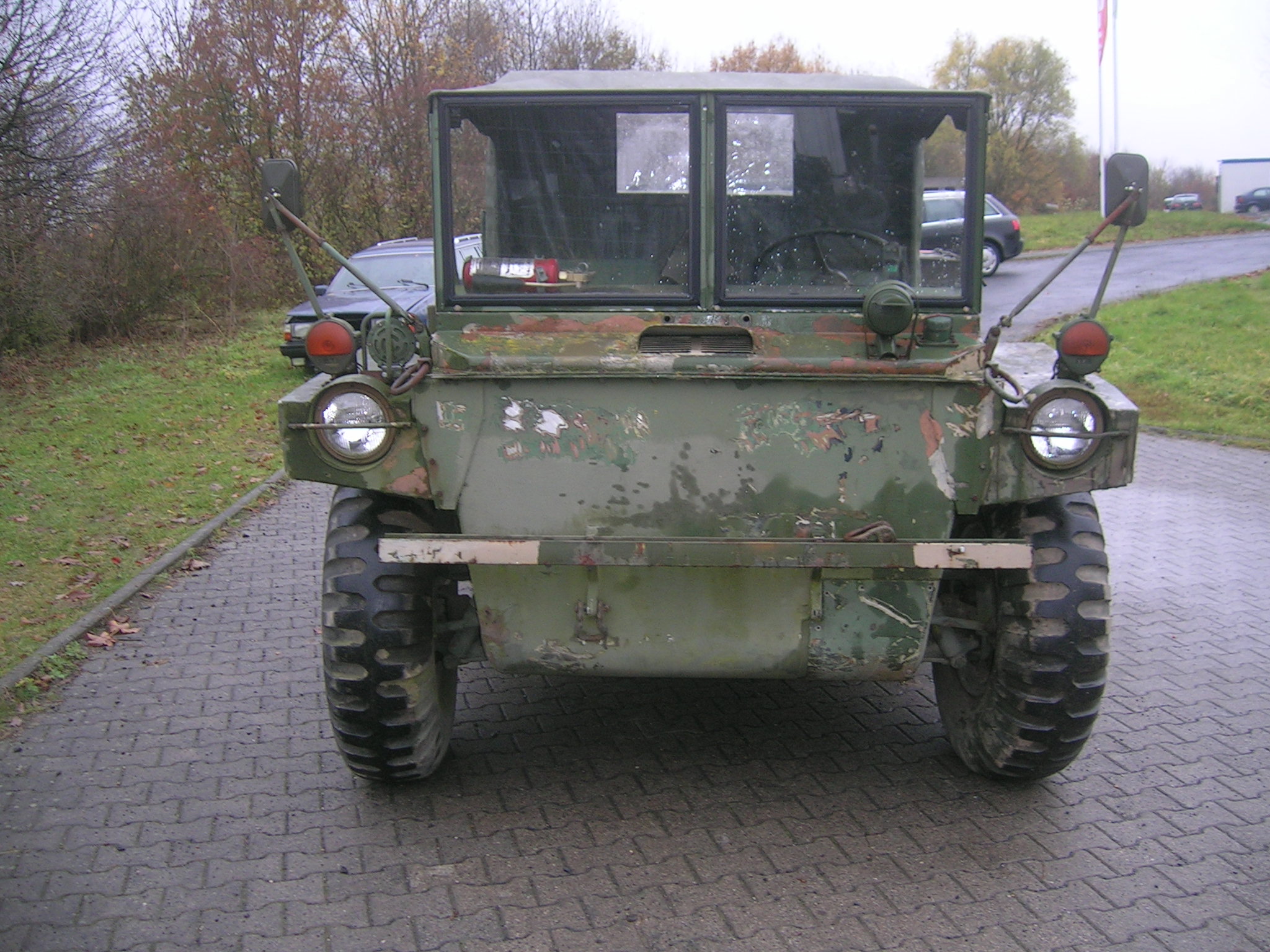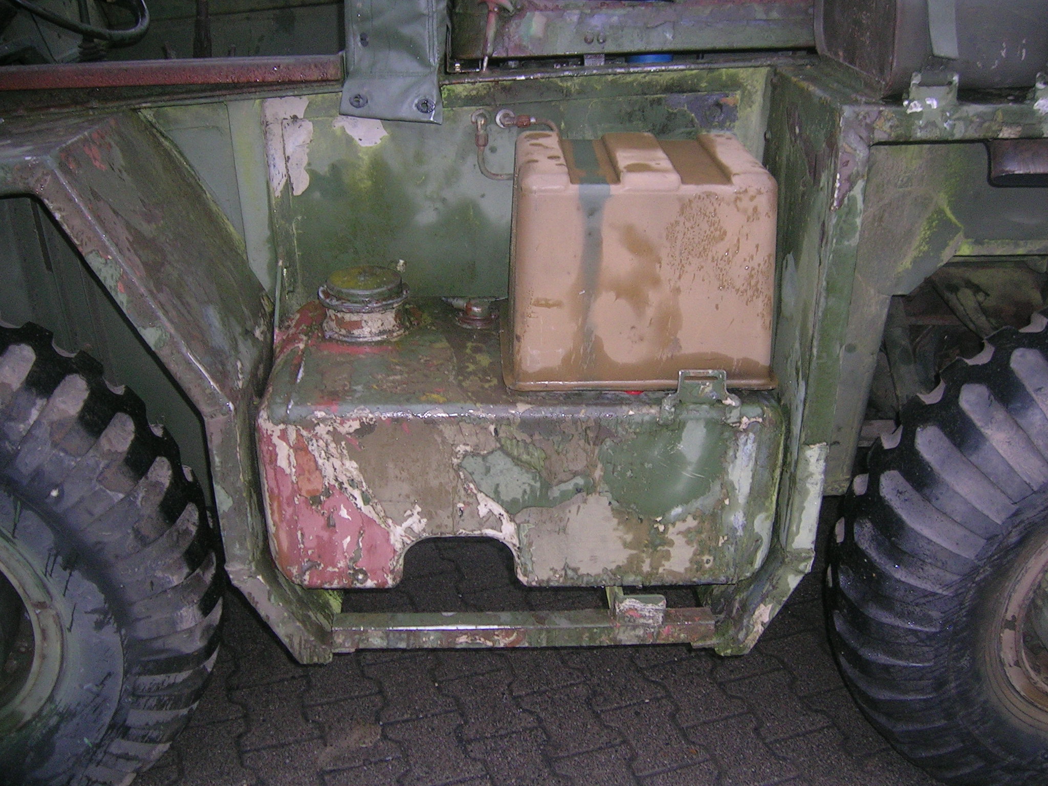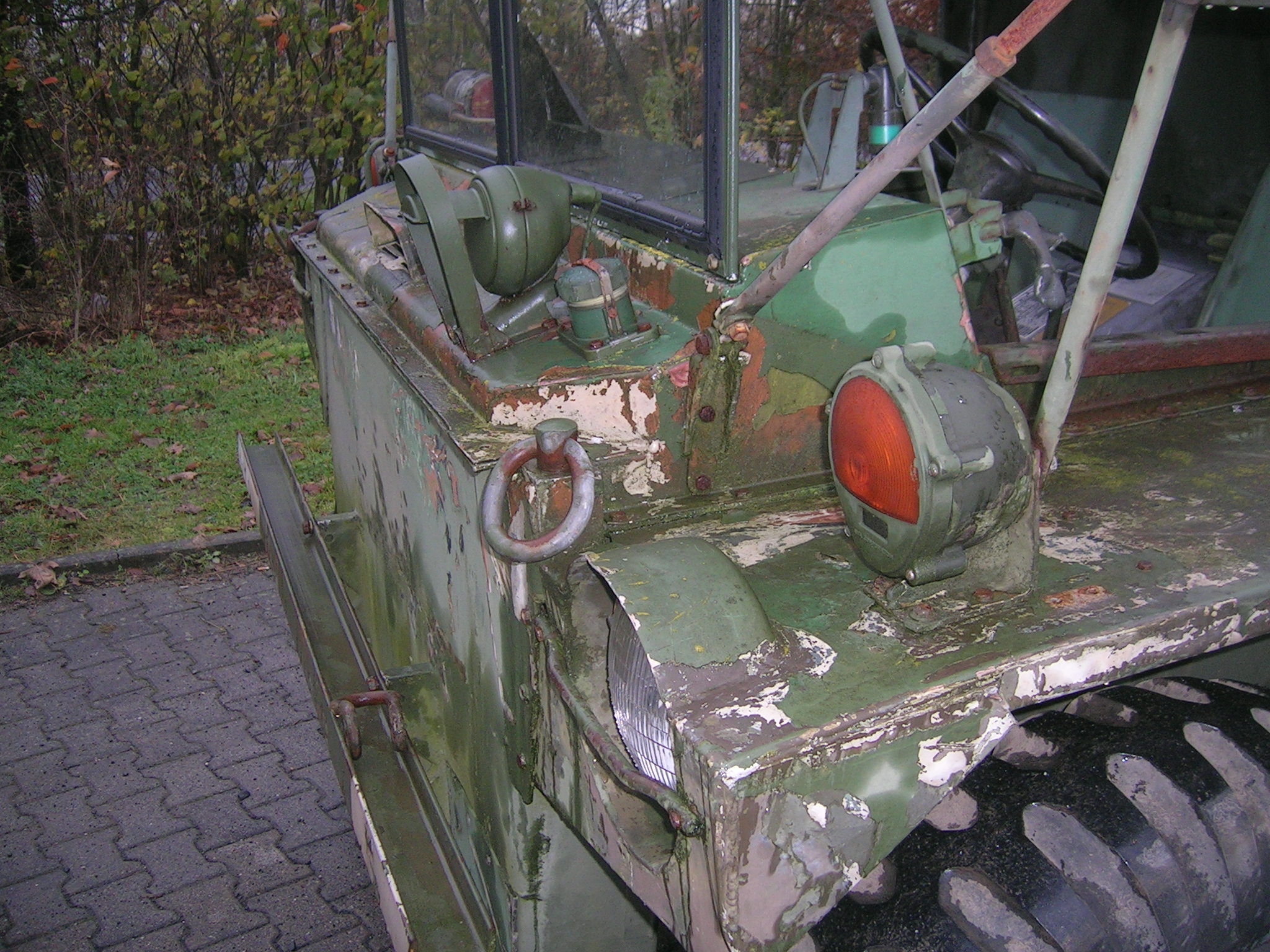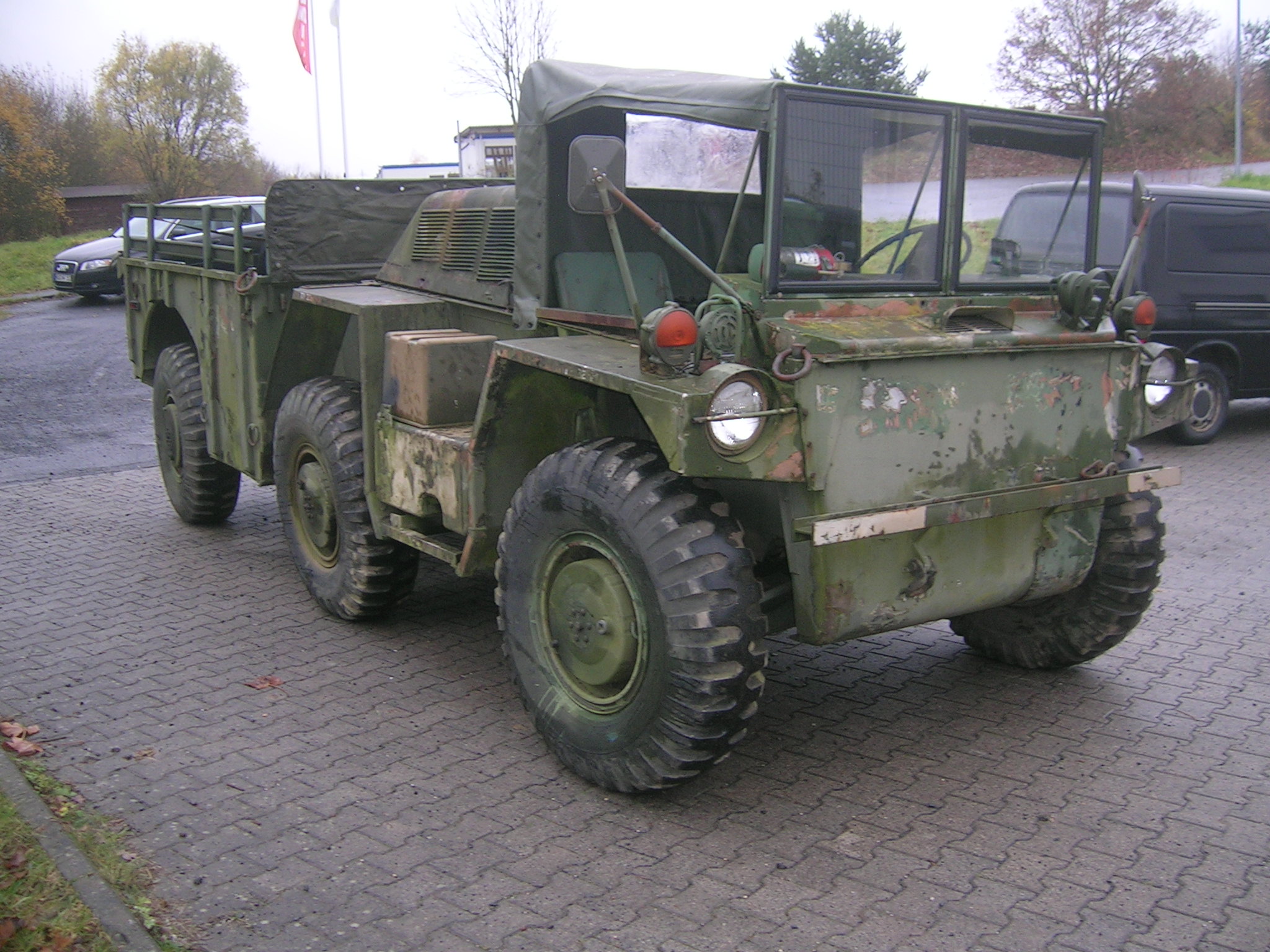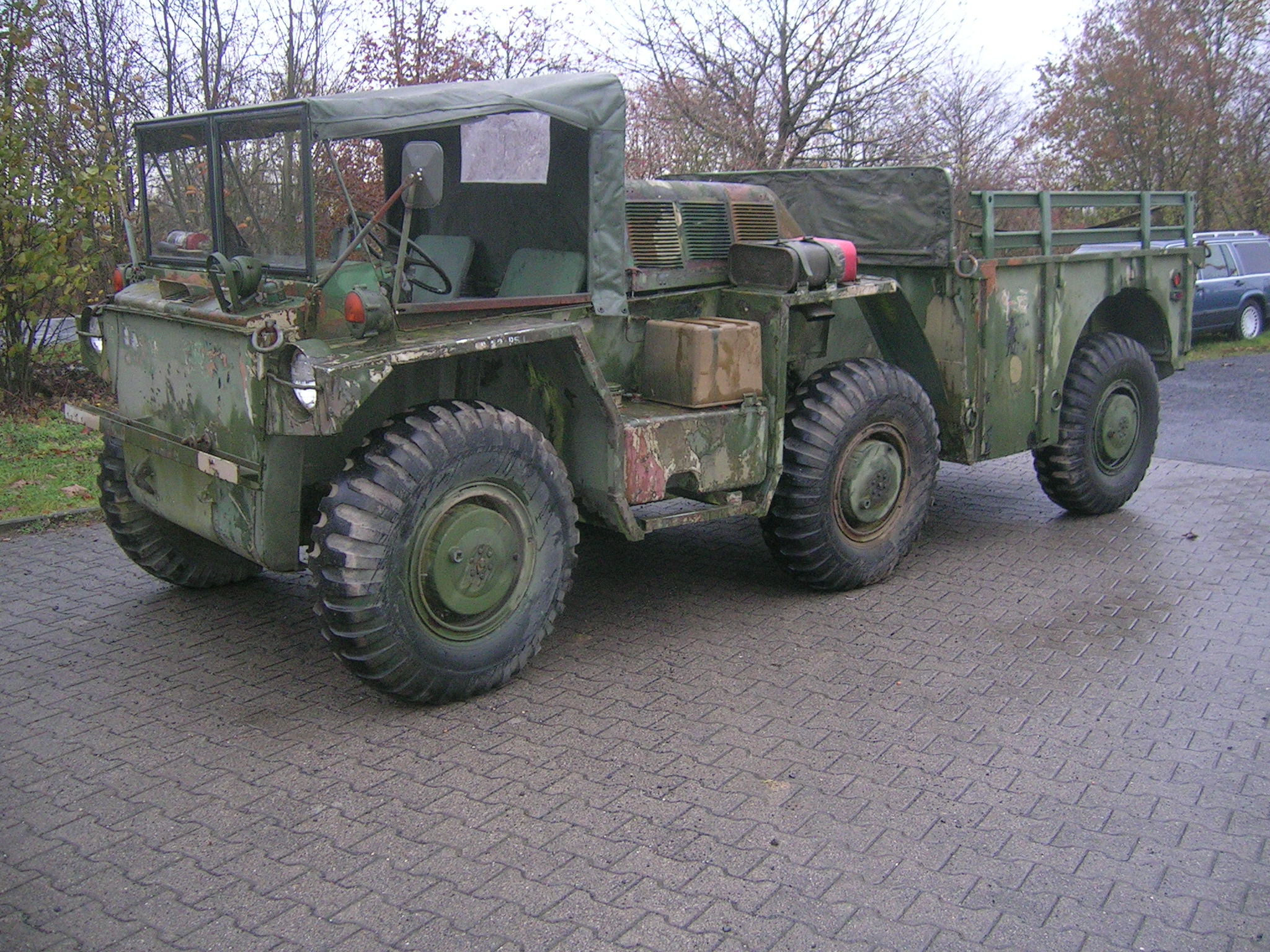 Gestern, also am 13.11.2009 habe ich mich wieder einmal auf die Suche gemacht. Zwei Bekannte und ich haben an diesem Freitag über 860 Kilometer abgespult. Wir besuchten Harald Klyne in Neustadt – Wied und haben dabei zwei Gama Goats begutachtet. Da der Markt für Gama Goats relativ klein ist, ist es natürlich etwas schwieriger überhaupt ein solches Fahrzeug aufzutreiben. Anschließend sind wir auf der A1 Richtung Norden weitergefahren um einen weiteren Gama Goat anzuschauen, zu dem ich leider keine Bilder habe. Der weitere Gama Goat war vom Lack her besser und vollständig. Glücklicherweise konnte ich hier gleich etwas Farbe kaufen. Insgesamt konnte ich 3 Gallonen (zirka 11,5 Liter) der Farbe Field Drab 30118 mit nach Hause nehmen. Nun habe ich zirka 18 Liter Field Drab in meinem „Tresor“.
