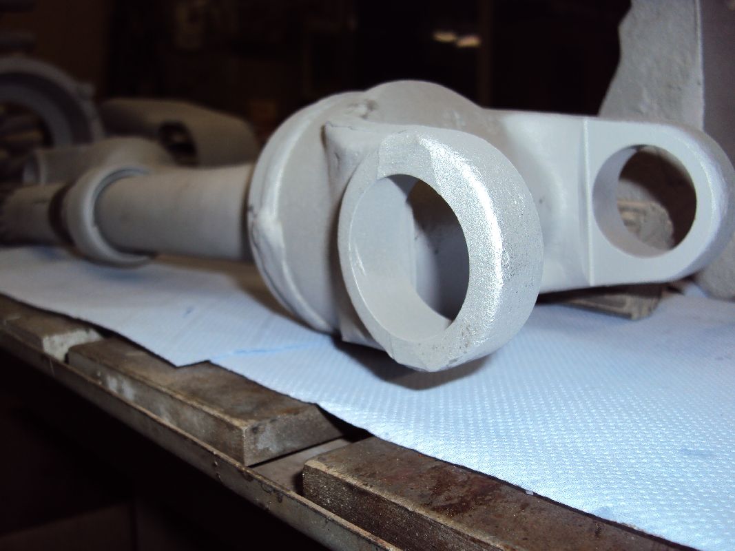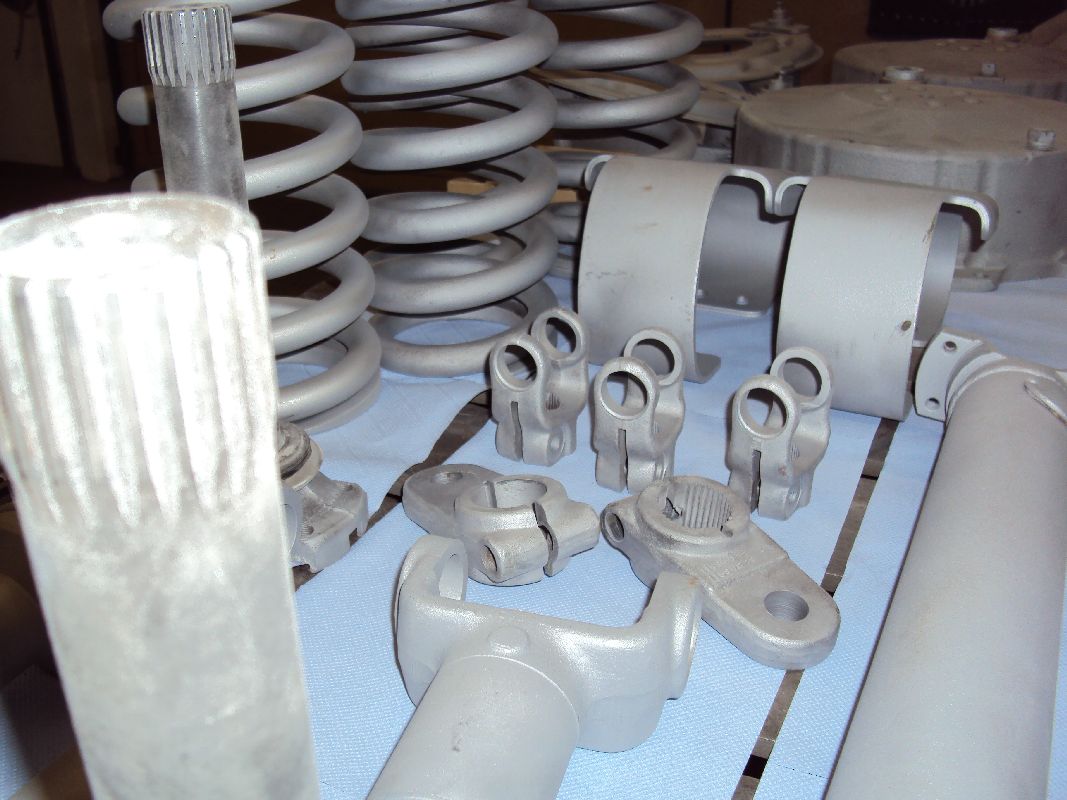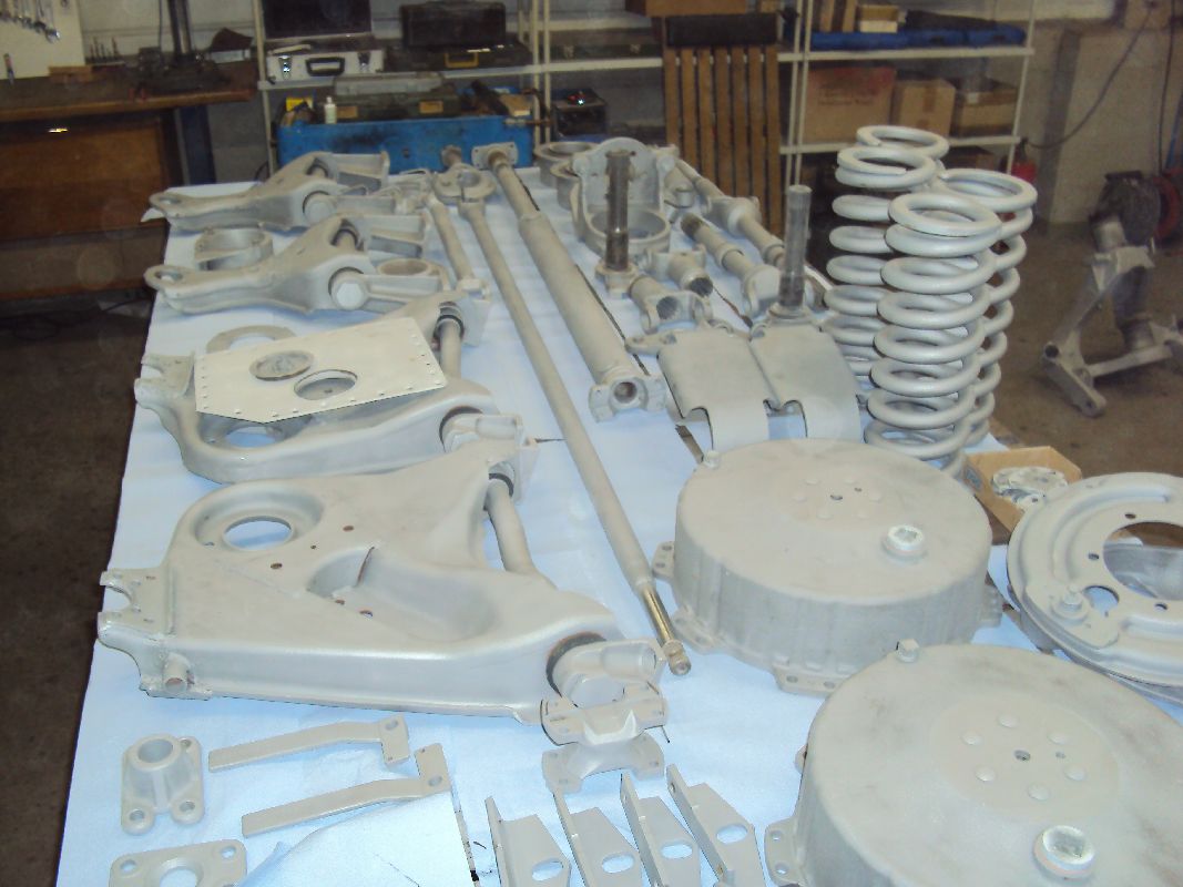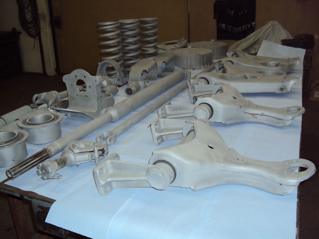 Gestern habe ich die ersten Teile vom Sandstrahlen geholt. Die Teile sind  nun komplett von altem Schmutz und Öl befreit, nun kann ich anfangen zu grundieren. Bei diesen Aussentemperaturen ist das natürlich nicht so einfach, ich kann allerdings mit meinem Feldheizgerät die Halle aufheizen (sowie auch die Teile).
