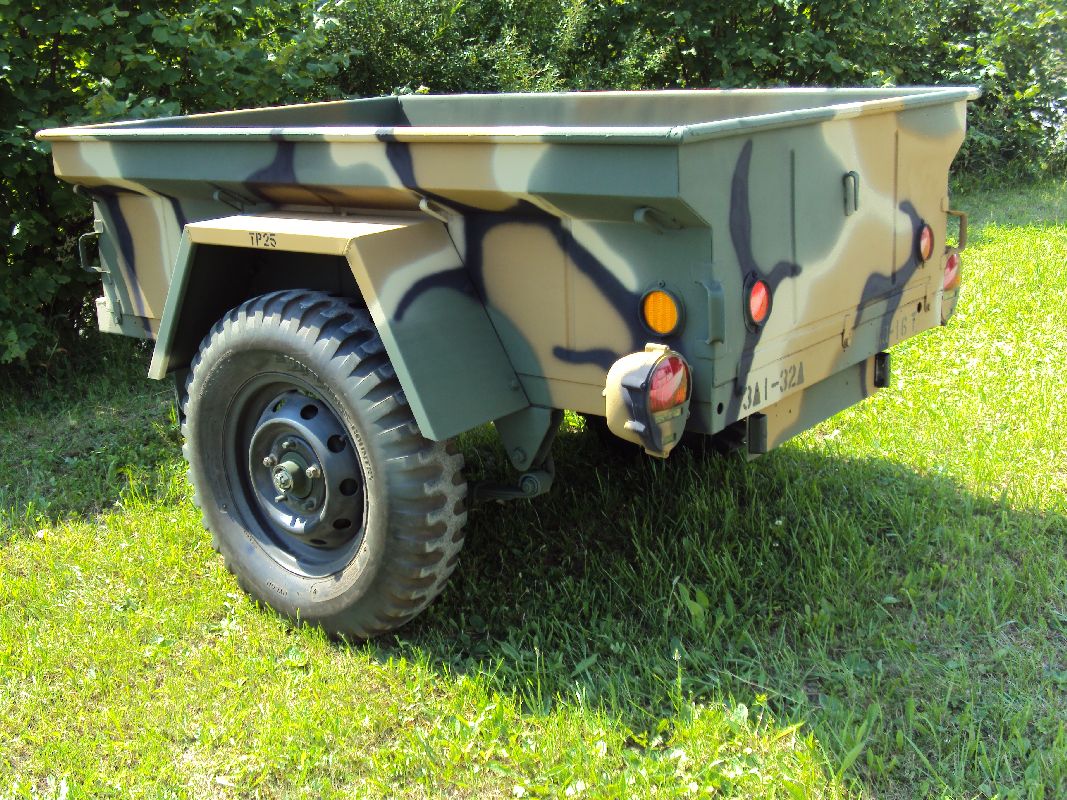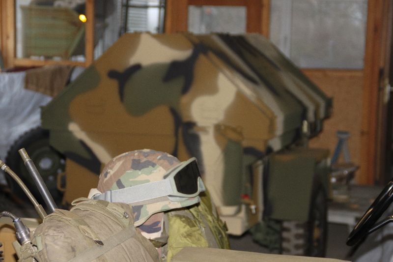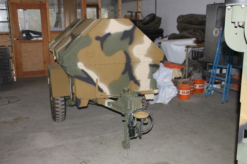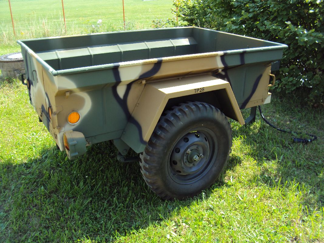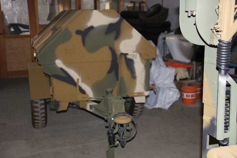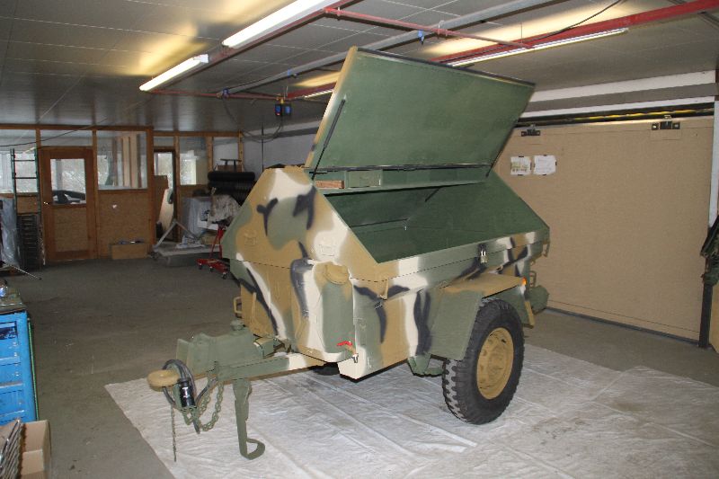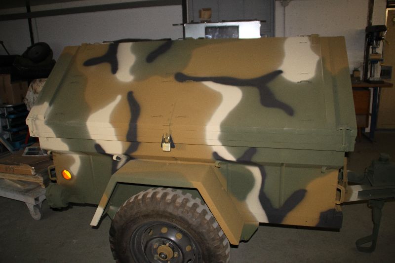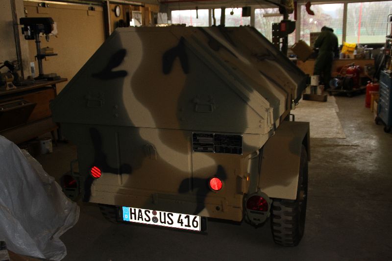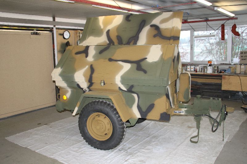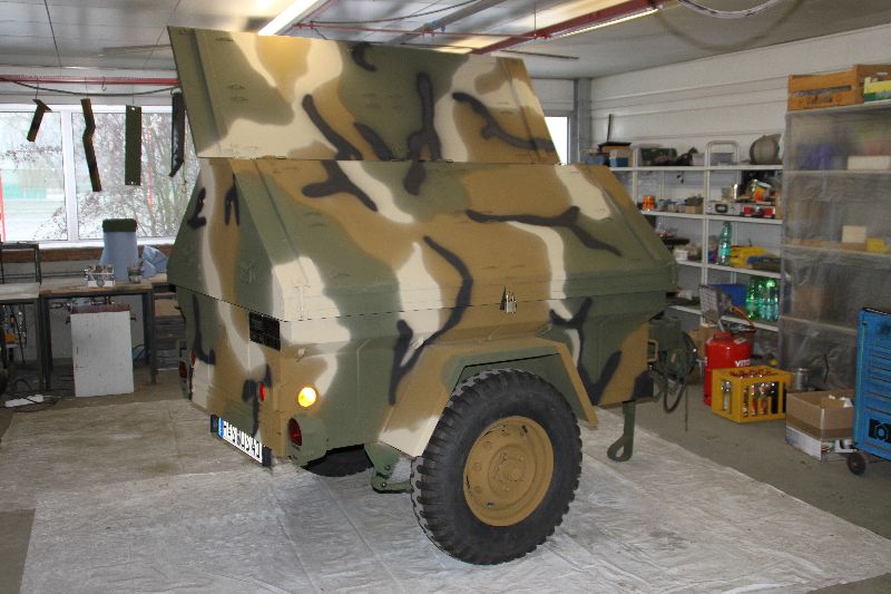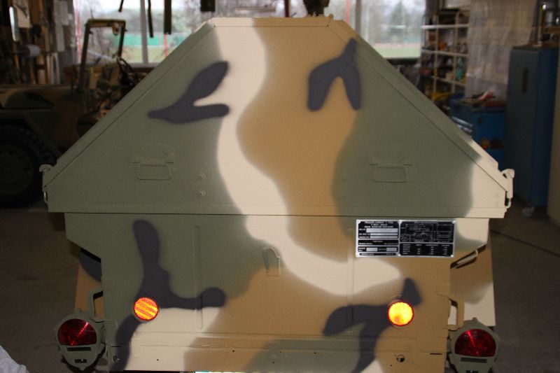 Nach vielen Problemen mit der Farbe und nach langer Zeit habe ich nun endlich die Farbe drauf. Natürlich habe ich das Teil wieder mit 4 Farben nach dem MERDC-Tarnschema lackiert (Tarnschema etwas leicht verändert). Die Anhängerwanne werde ich innen nochmals lackieren, da einiges an Farbnebel rein ging und sichtbar ist. Es ist natürlich noch einiges zu machen, sollte aber in den nächsten 14 Tagen erledigt sein (mir fehlt noch der Stoßdämpfer für die Auflaufbremse).
