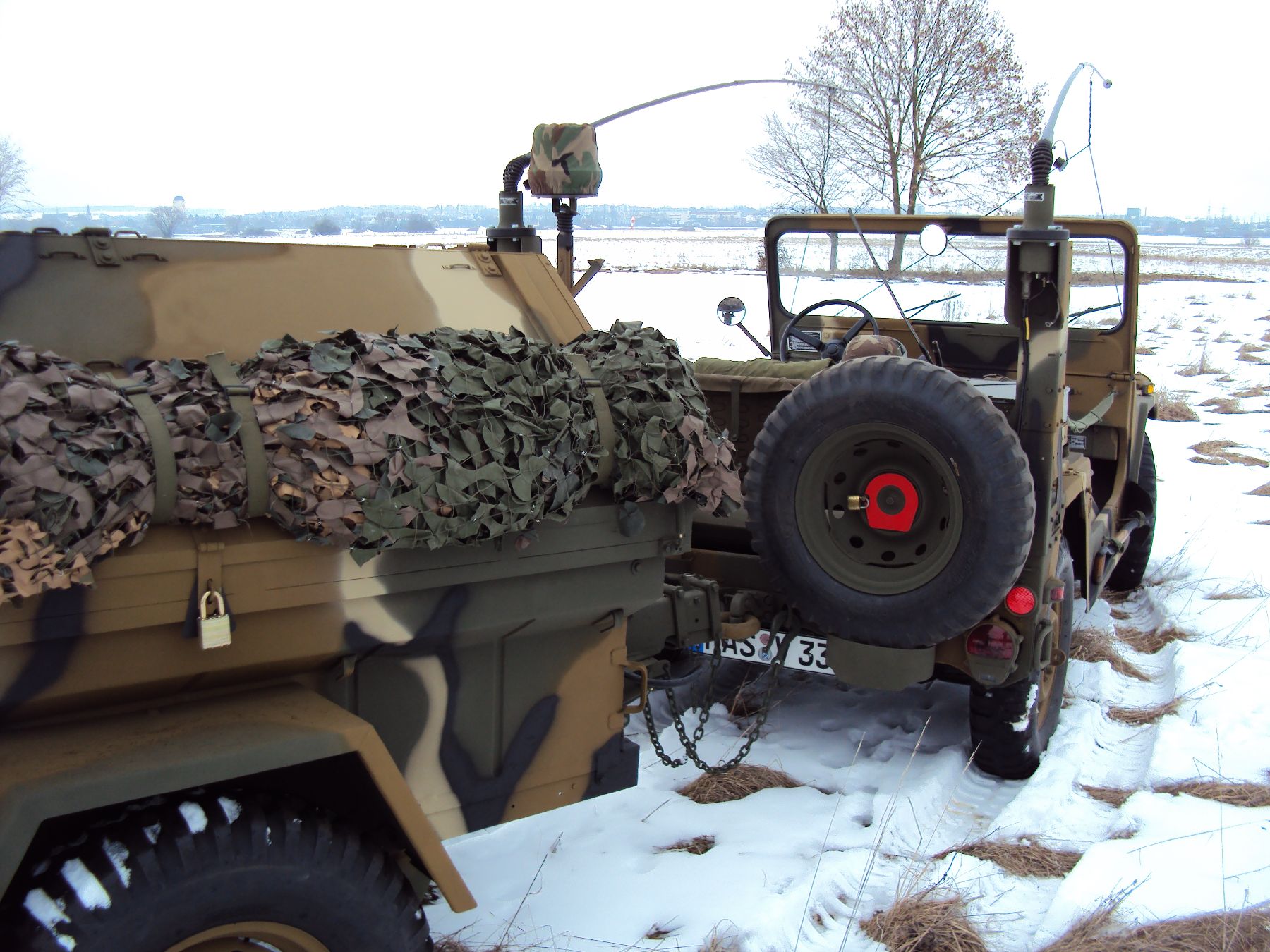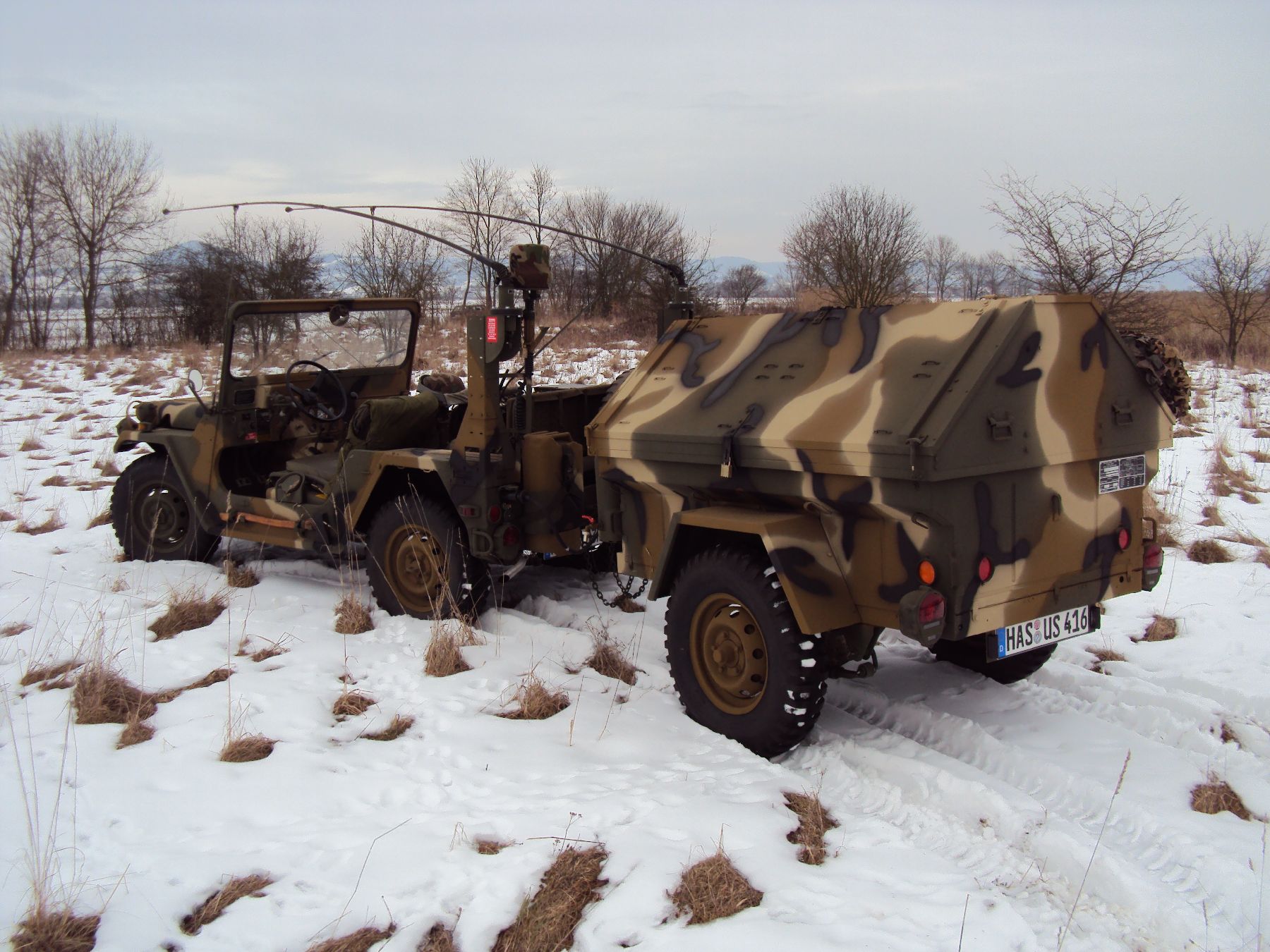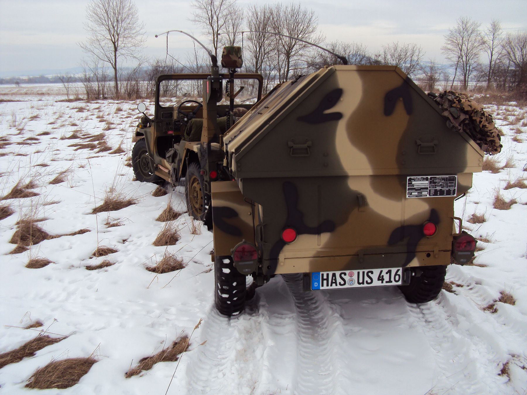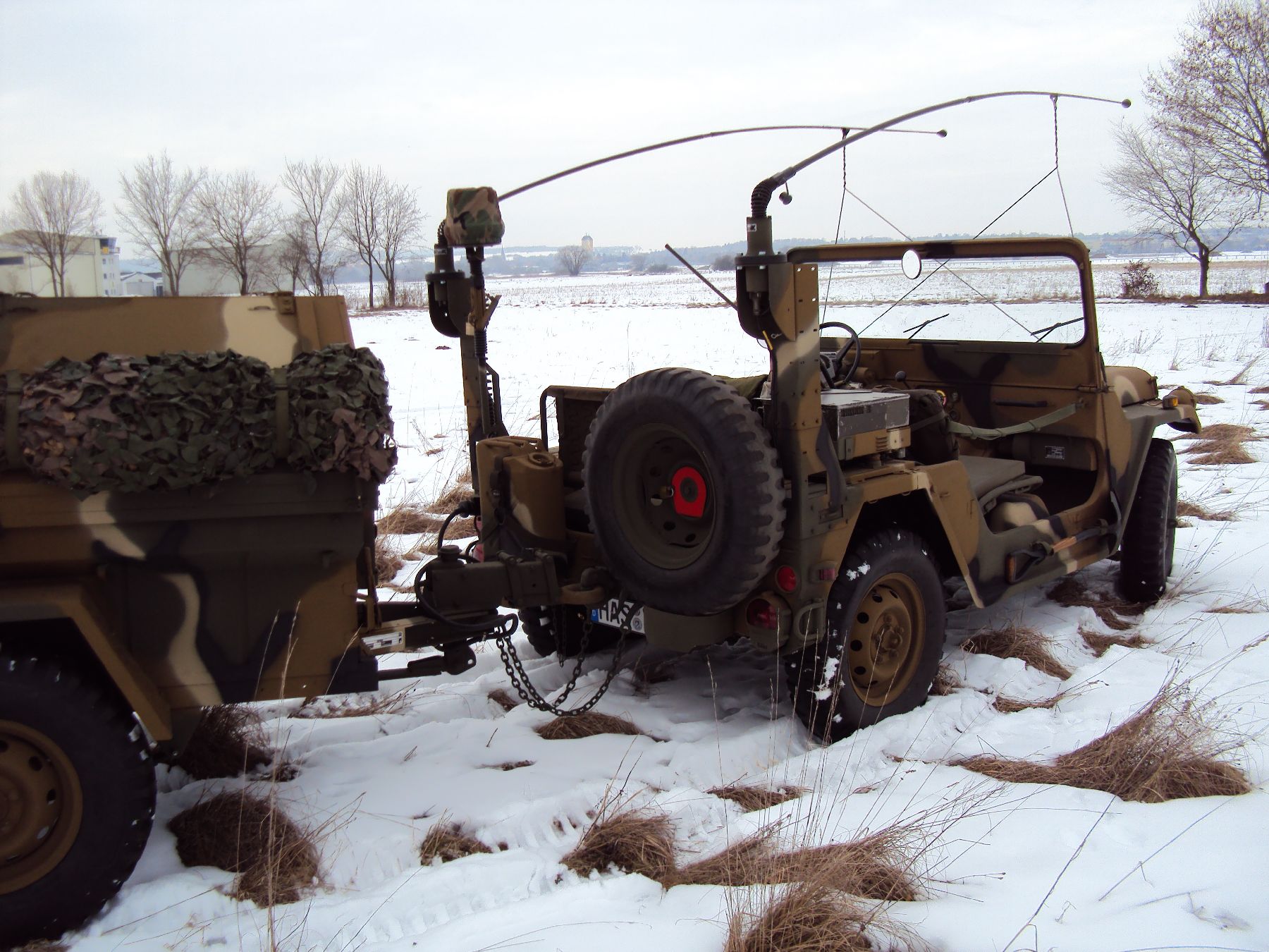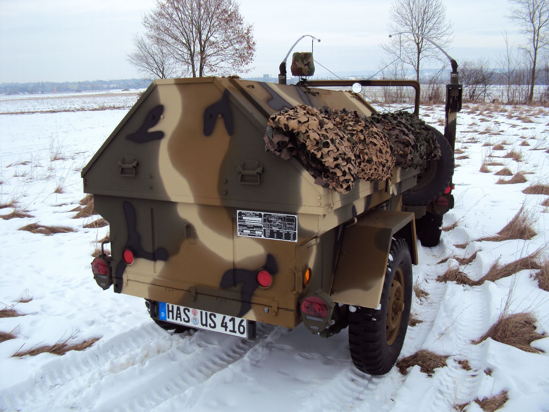 Nach vielen Problemen mit der Farbe und nach langer Zeit habe ich nun endlich die Farbe drauf. Natürlich habe ich das Teil wieder mit 4 Farben nach dem MERDC-Tarnschema lackiert (Tarnschema etwas leicht verändert). Die Anhängerwanne werde ich innen nochmals lackieren, da einiges an Farbnebel rein ging und sichtbar ist. Es ist natürlich noch einiges zu machen, sollte aber in den nächsten 14 Tagen erledigt sein (mir fehlt noch der Stoßdämpfer für die Auflaufbremse).