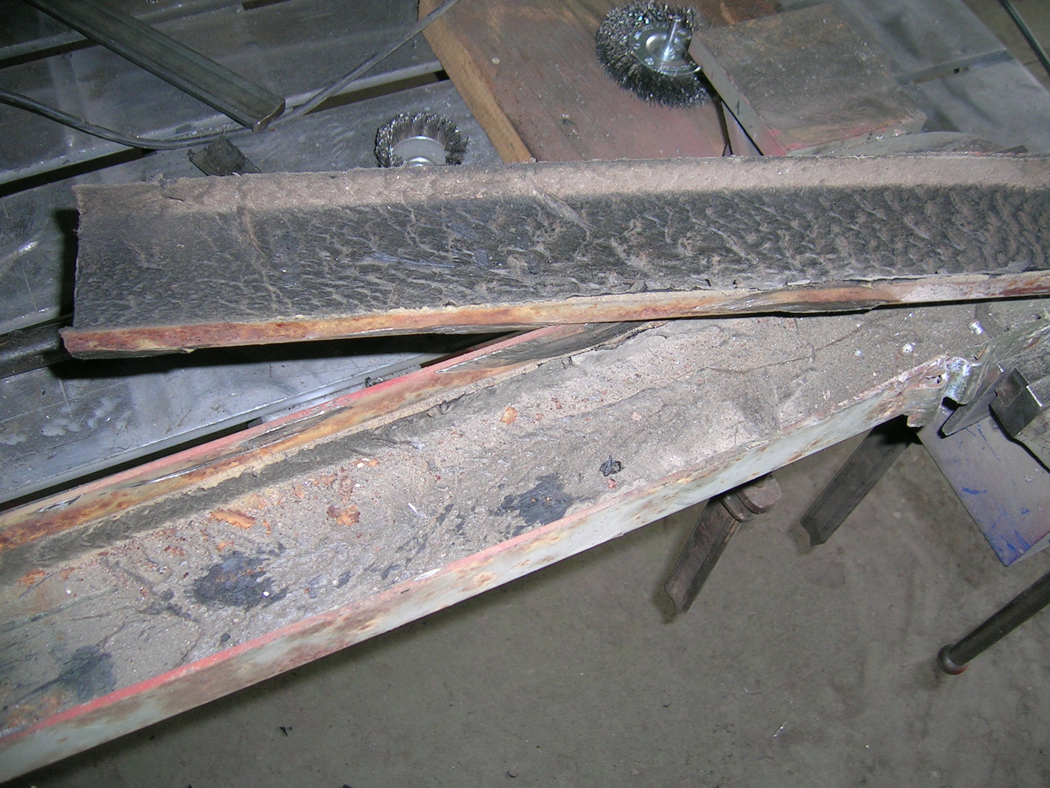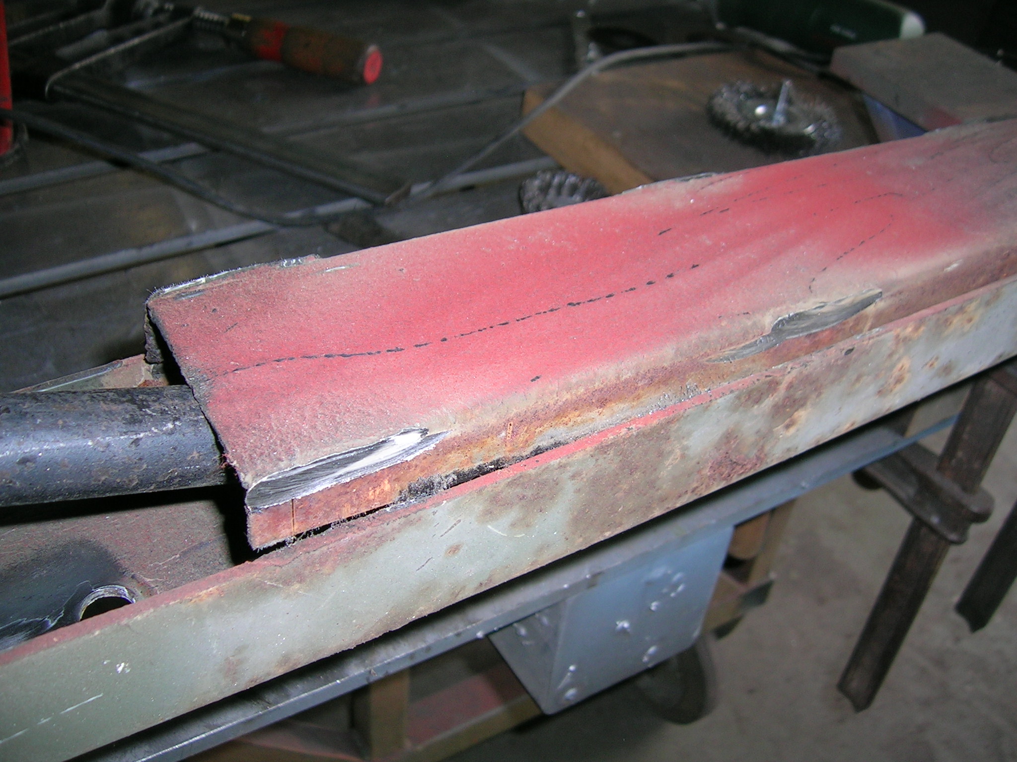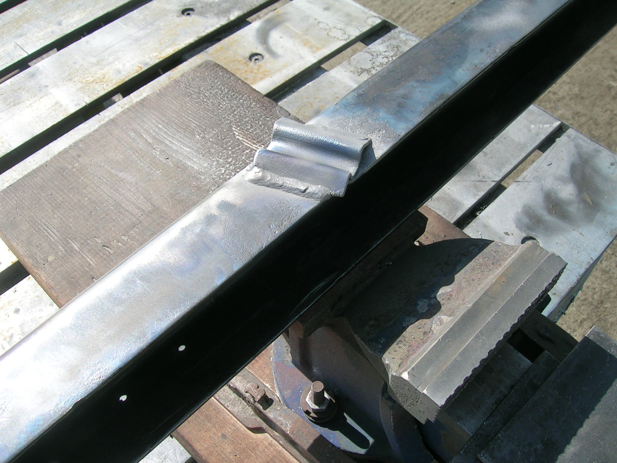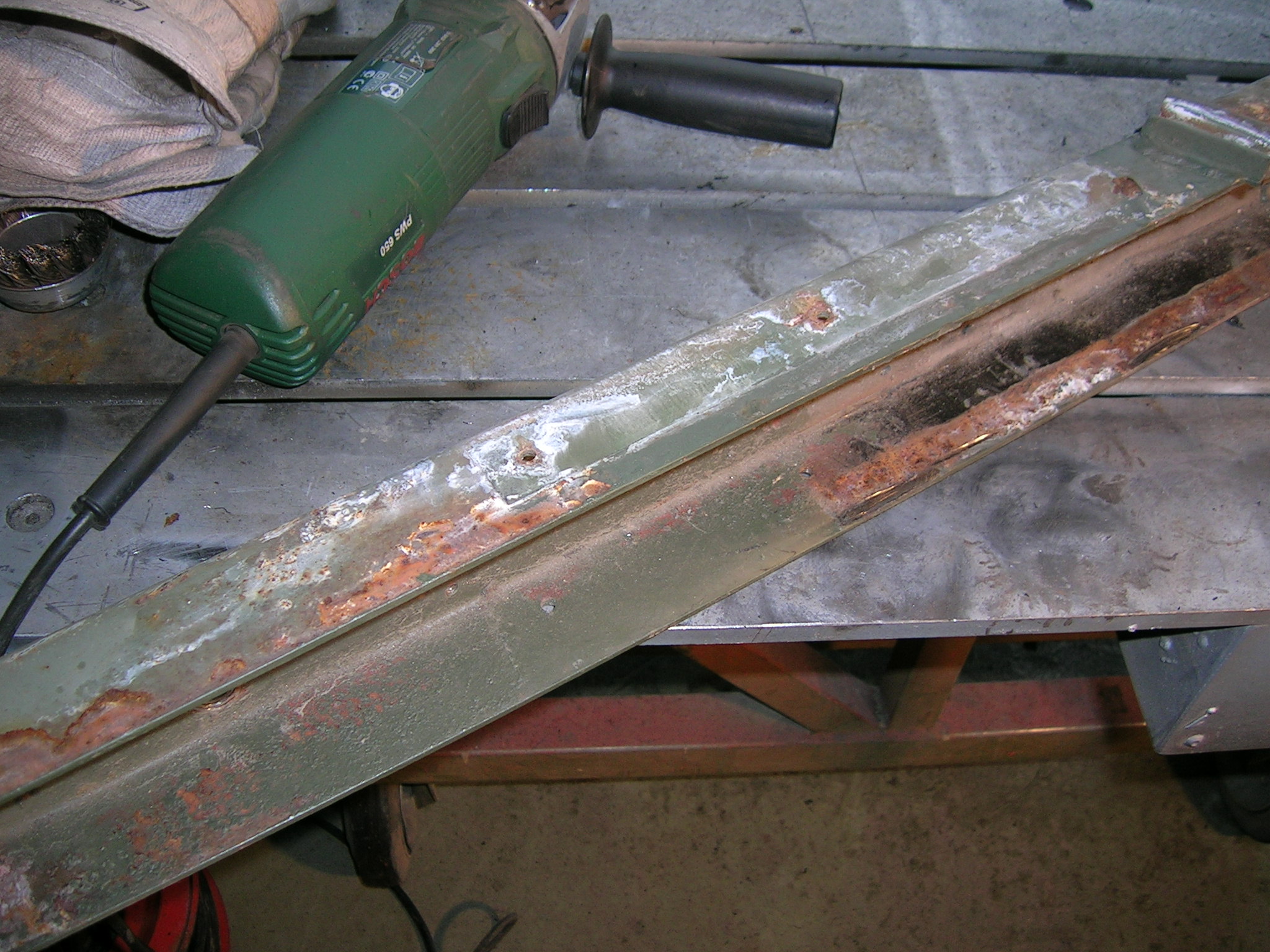 Heute habe ich die beiden U-Profile der Deichsel wieder verschweißt und die Schweißnähte abgeschliffen sowie grundiert. Wie man auf einem Bild sehen kann, muss ich innen nachgrundieren, da durch die Wärme die Grundierung abging. Aber ich denke das ist kein Problem, das werde ich mit einer Lanze machen ähnlich wie beim Hohlraumversiegeln.